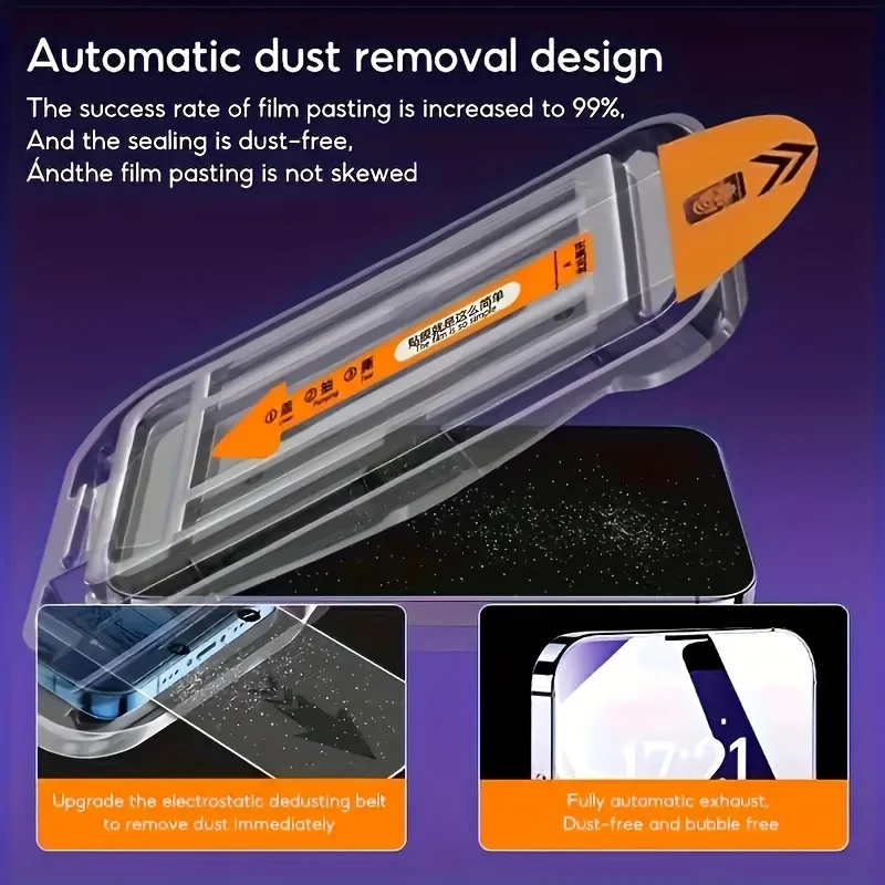 La coque d’installation intégrée capture automatiquement la poussière avant la pose. Il suffit de clipser l’ensemble sur l’iPhone, de tirer la languette prévue, et la vitre se positionne seule avec une précision millimétrique. Aucun réglage manuel, aucune erreur possible : votre écran est protégé instantanément et parfaitement.